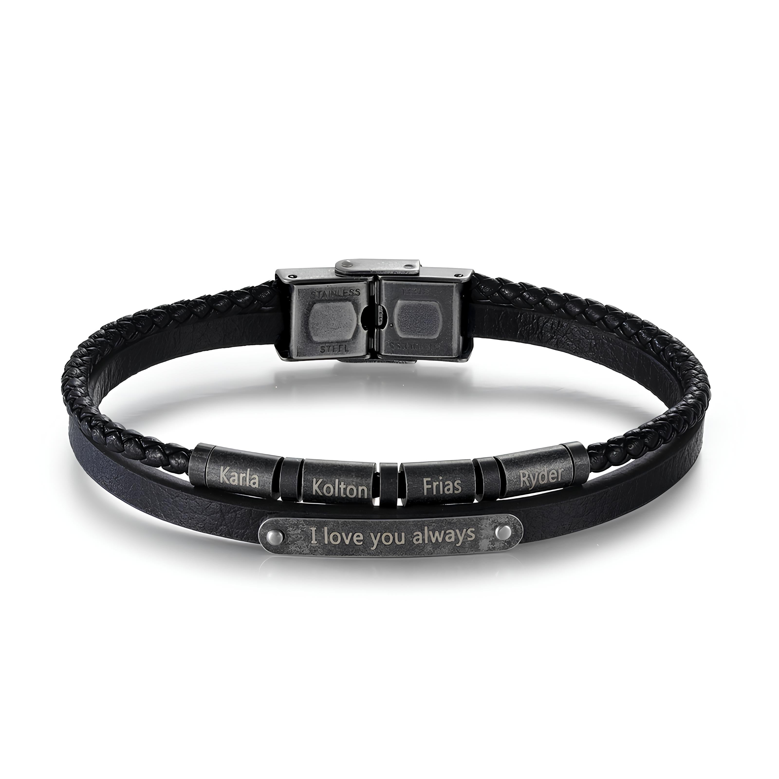 Made from braided black PU leather with polished stainless steel accents, this bracelet features up to 5 engraved name beads plus an optional personalized message on the front bar. Whether it's names of children, a special date, or a phrase that means something, you can make it truly yours.