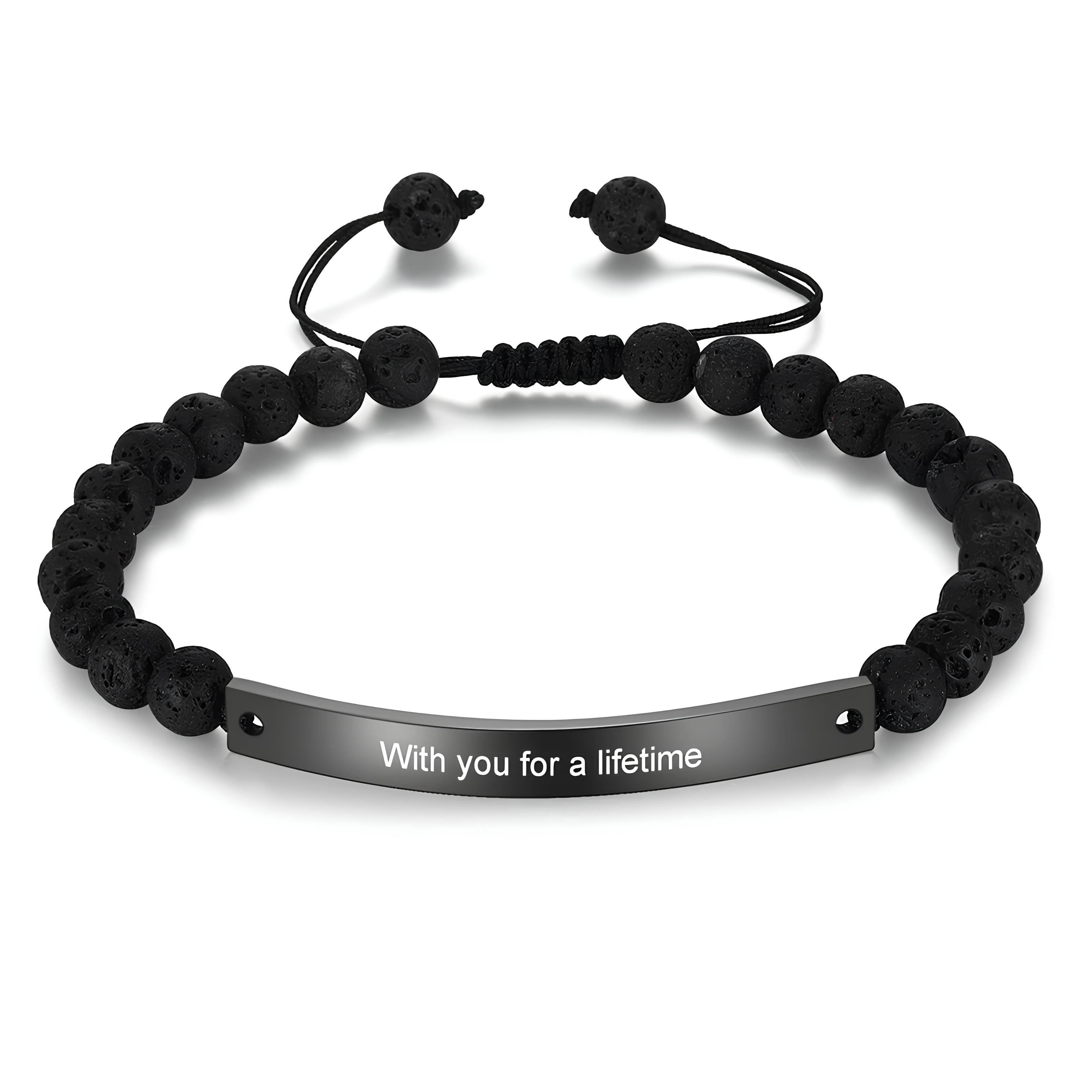 Make your message unforgettable with our Custom Lava Rock Bar ID Bracelet—a bold and meaningful piece designed to carry your words with style. This bracelet features natural black lava stones paired with a personalized bar, engraved on both the front and back. The adjustable chain ensures a perfect fit for daily wear or gifting.