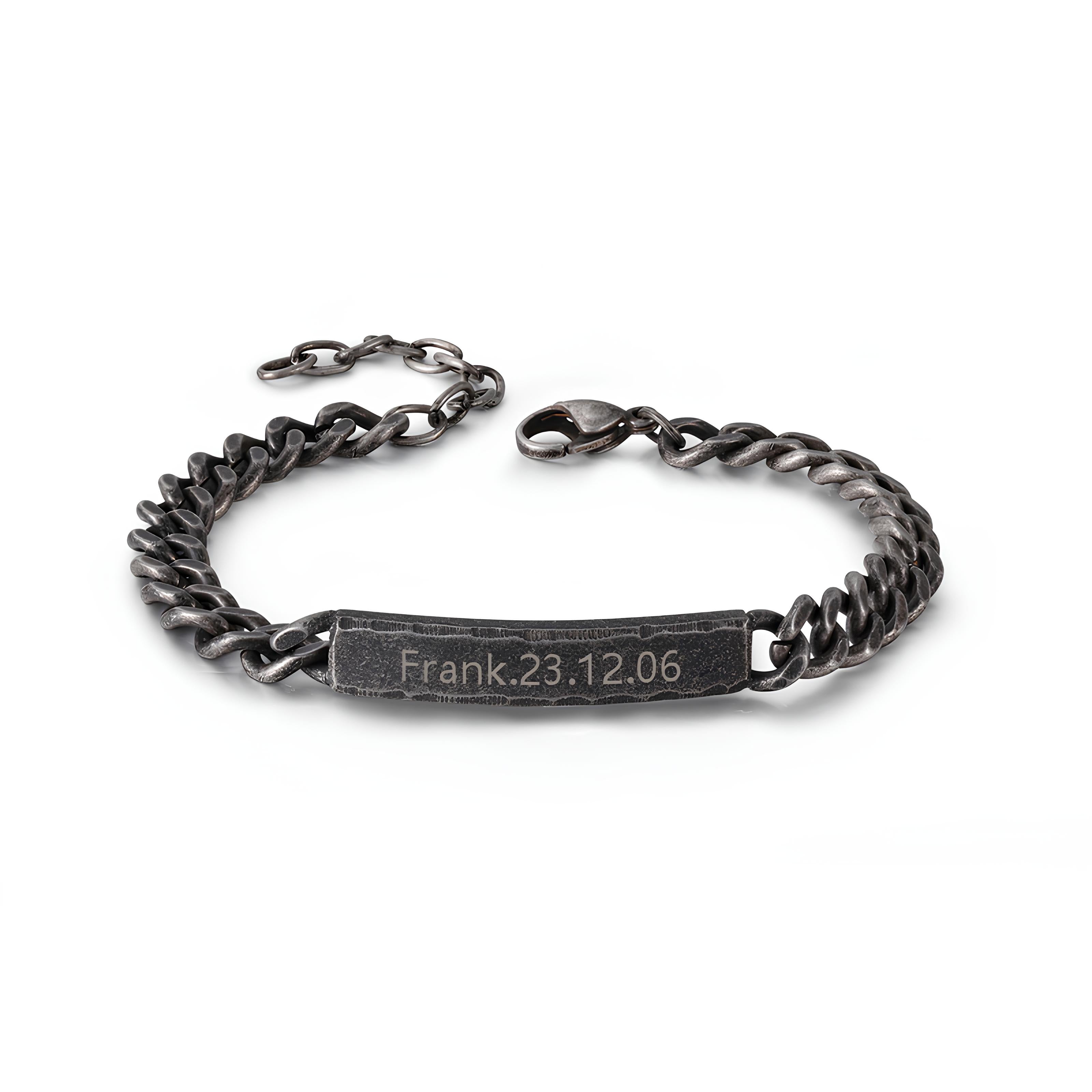 Timeless, masculine, and personal—our Custom Vintage ID Bracelet for Men is the perfect blend of rugged style and sentiment. Finished in bold black oxidized stainless steel, this bracelet features front and back engraving, giving you space to personalize it with a name, date, or meaningful words. The 8.3-inch chain includes a 2-inch extension for a flexible fit.