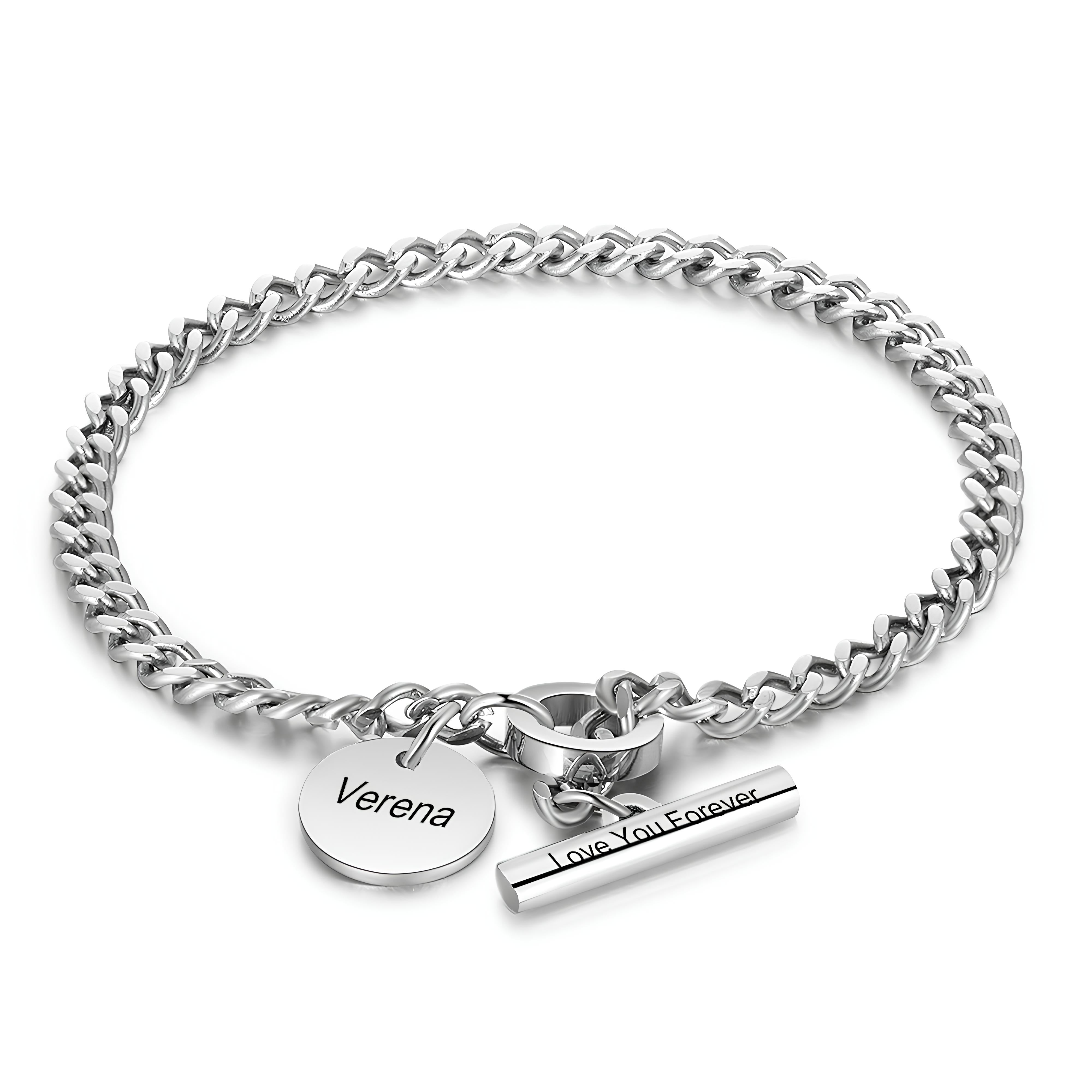 Add a personal touch to timeless style with our Engraved Cuban Chain Bracelet. This bold and elegant bracelet is available in silver or gold and features two customizable engravings—one on the disc and one on the clasp. With its 8.3-inch length, it’s designed to provide a comfortable and secure fit, making it a perfect accessory for everyday wear or a thoughtful gift.