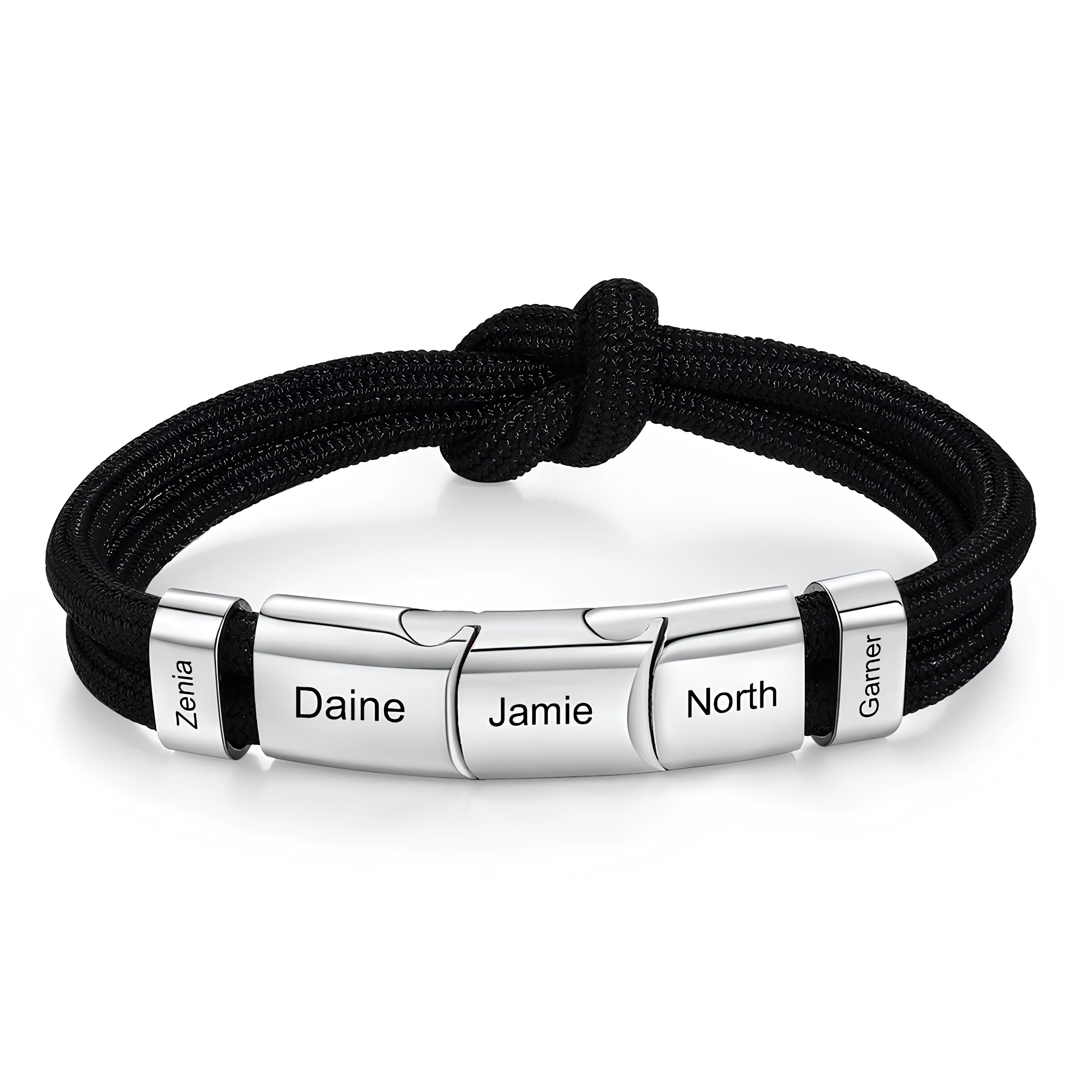 Celebrate strength, connection, and family with our Engraved Rope Bracelet with Knot. Designed for men who value both meaning and style, this bracelet features a durable black or silver cord and your choice of 5 or 7 engraved name charms. Whether it’s for kids, loved ones, or a powerful message, each name is a tribute you can wear daily.