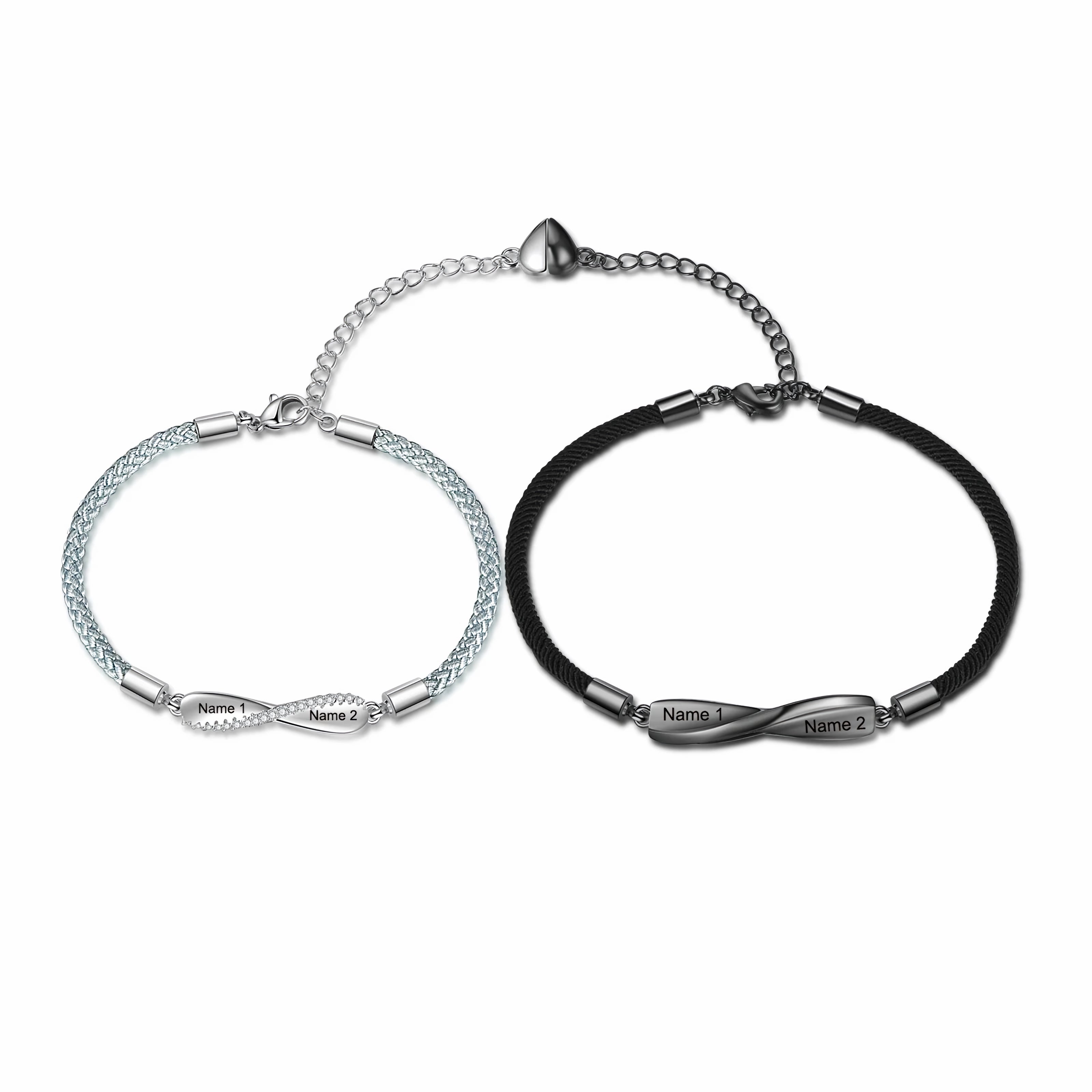 Celebrate your love with our Infinity Matching Bracelet for Couples, a beautifully designed set symbolizing forever. This black and white bracelet set allows each partner to engrave two names for a truly personal touch. With adjustable chain sizes—7.3 inches for her, 7.9 inches for him—these bracelets provide a perfect fit while offering a lasting reminder of your bond.