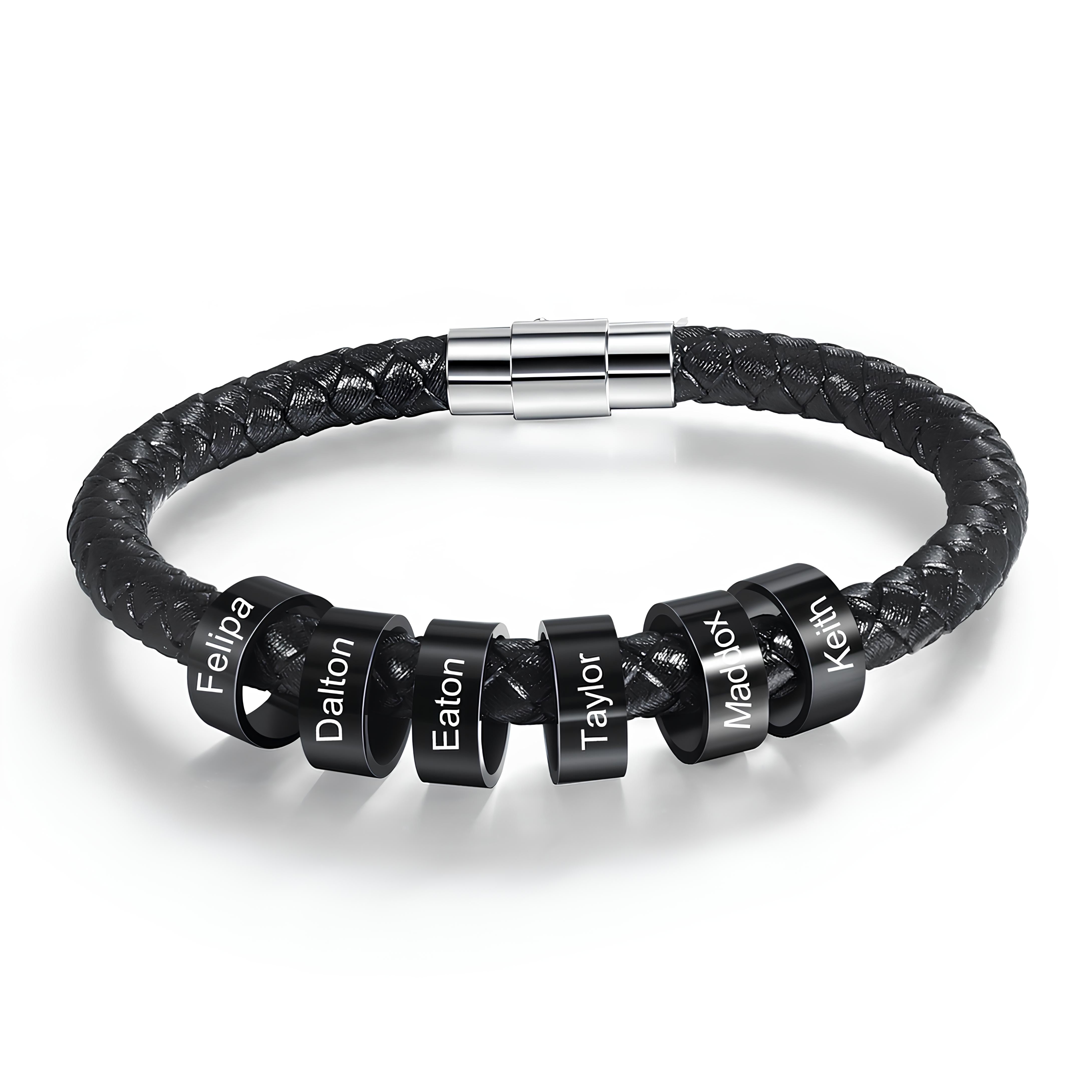 Add a touch of personalized style with our Leather Men’s Bracelet with Charms. Crafted from premium black leather with your choice of silver or black charms, this bracelet can be customized with 1-15 engraved names to represent loved ones or meaningful words. The 8.5-inch leather chain includes a secure magnetic clasp, ensuring comfort and ease while wearing. Designed to be tarnish-resistant and long-lasting, it’s a perfect piece for daily wear.